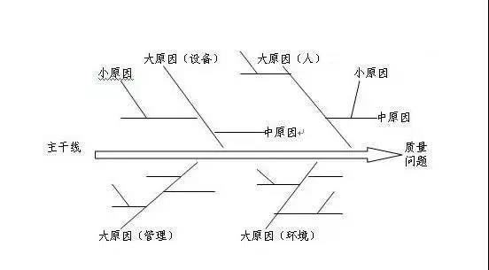 ③ 畫出干線主骨、中骨、小骨及確定重大原因(一般從5M1E即人Man、機Machine、料Material、法Method、測Measure、環Environment六個方面全面找出原因);