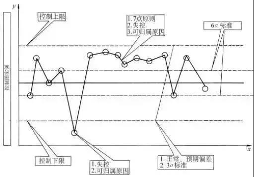 控制圖是對生產過程質量的一種記錄圖形,圖上有中心線和上下控制限,并有反映按時間順序抽取的各樣本統計量的數值點。中心線是所控制的統計量的平均值,上下控制限與中心線相距數倍標準差。多數的制造業應用三倍標準差控制限,如果有充分的證據也可以使用其它控制限。